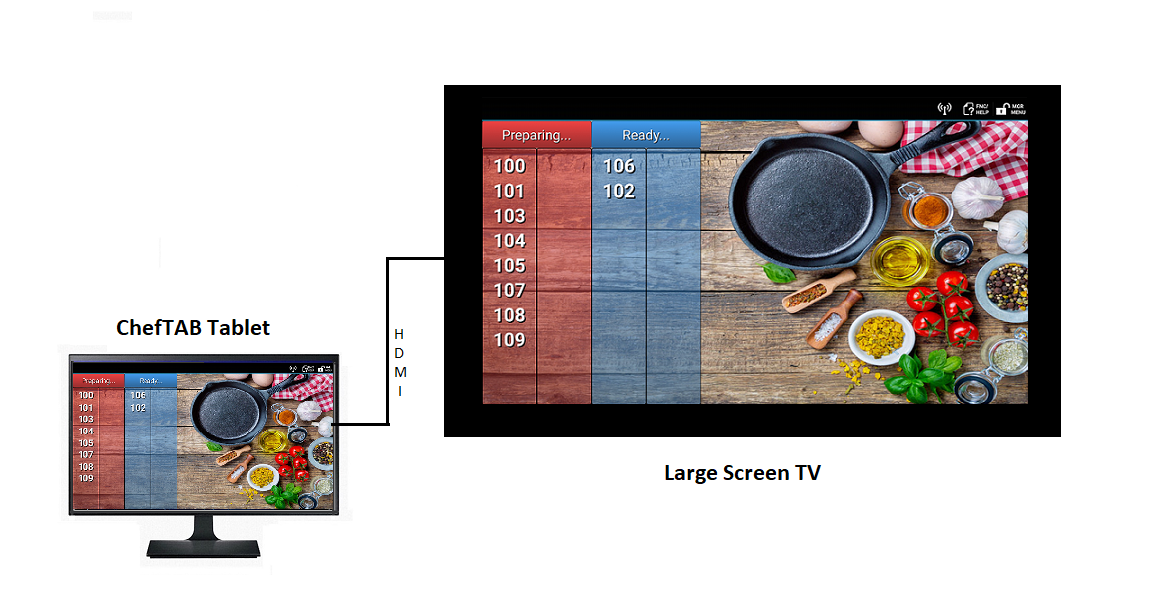 The MicroPlus order ready display alerts your customers as soon as their order items are ready by showing "Now Ready" numbers. The Order Ready system consists of a ChefTab tablet working in conjunction with a large screen TV mounted in the customer pick up area. Once the customer picks up their order the operator just touch bumps the order from the "Now Ready" column and it is removed from the screen. The backround of our order ready can be customized with an image or with multiple images to create a one of a kind slideshow.